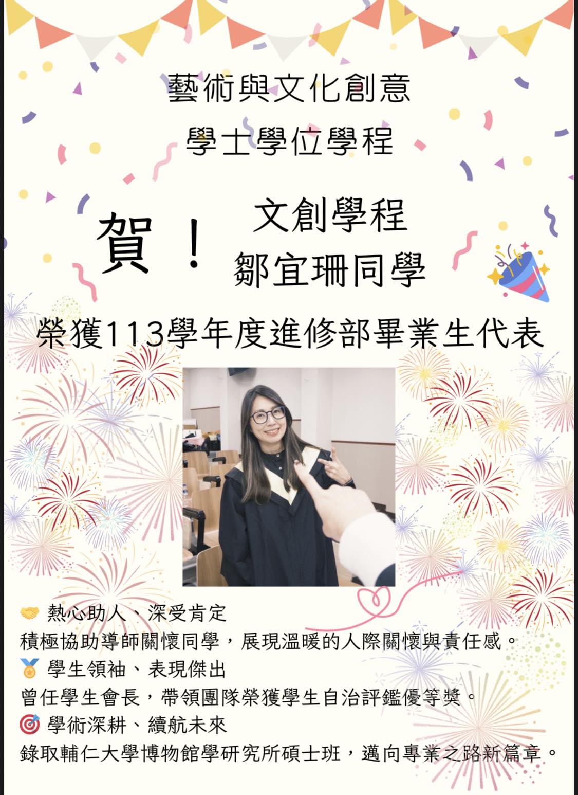 榮獲113學年度輔大進修部畢業生代表!