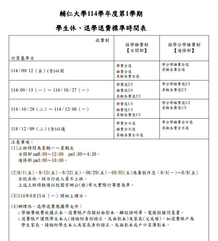 【學費】114-1學年度學生休、退學退費標準時間表